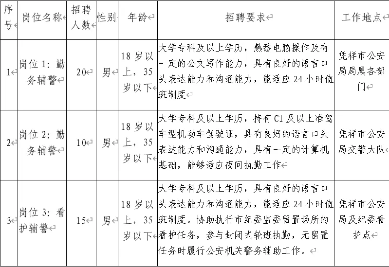 為適應憑祥市公安機關管理工作發(fā)展需要,憑祥市公安局決定面向社會公開招聘40名警務輔助人員(以下簡稱輔警)。具體事宜如下: