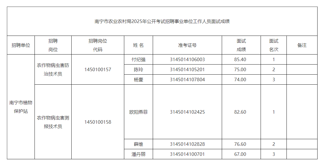 南寧市農(nóng)業(yè)農(nóng)村局2025年公開(kāi)考試招聘事業(yè)單位工作人員面試成績(jī)