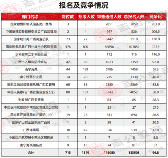 廣西海關(guān)系統(tǒng)總體:平均競(jìng)爭(zhēng)比約為31:1,競(jìng)爭(zhēng)熱度相對(duì)較低。