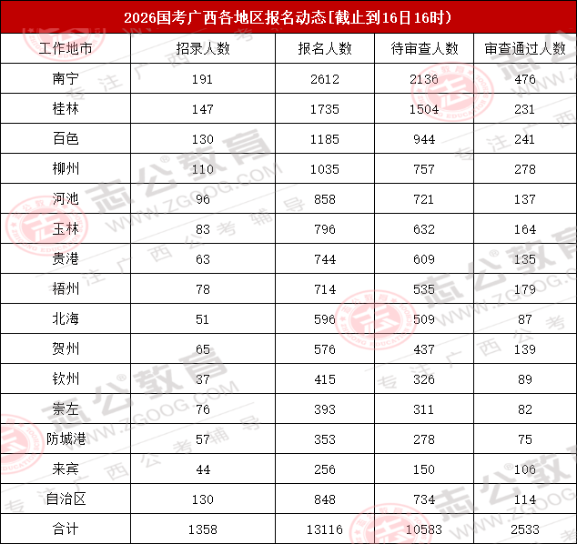 截止到16日16時(shí),2026國考廣西地區(qū)各地市報(bào)名人數(shù)最多的地市為南寧、桂林、百色,其中南寧報(bào)名人數(shù)為2612人,位居第一!整體報(bào)考人數(shù)達(dá)13116人!對此,小志建議大家,報(bào)考崗位時(shí)需將自身職業(yè)愿景與個(gè)人實(shí)際條件(如專業(yè)、學(xué)歷、基層經(jīng)驗(yàn)等)緊密結(jié)合,理性分析崗位競爭情況,最終做出最適合自己的選擇。