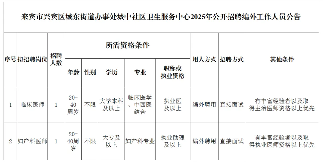 2025年來(lái)賓市興賓區(qū)城中社區(qū)衛(wèi)生服務(wù)中心公開(kāi)招聘編外工作人員公告