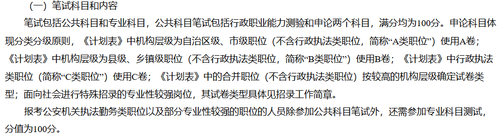 公共科目為行政職業(yè)能力測驗(100 分)、申論(100 分)。申論分 A/B/C 卷:自治區(qū) / 市級職位(非行政執(zhí)法類)用 A 卷;縣 / 鄉(xiāng)鎮(zhèn)級職位(非行政執(zhí)法類)用 B 卷;行政執(zhí)法類職位用C卷。