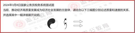 再來看2024年3月8日的 “質量與速度” 題,更是結合經濟政策 + 稅務職能,要求用 “太極圖” 等符號具象化論述,體現了 “稅務 + 宏觀政策” 的復合考察。
