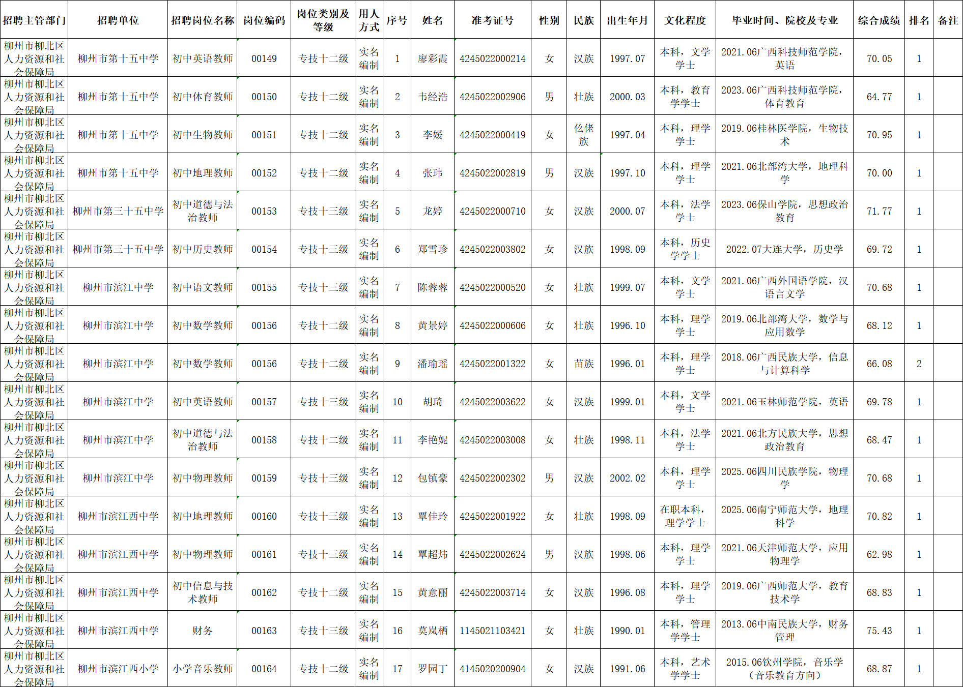 根據(jù)《柳州市2025年度下半年事業(yè)單位公開考試招聘工作人員公告》要求及安排,廖彩霞等17名同志經(jīng)面試、考察、體檢合格,符合聘用條件。經(jīng)研究決定,擬聘用廖彩霞等17名名同志為我區(qū)事業(yè)單位工作人員,現(xiàn)予以公示,公示期為5個(gè)工作日(2026年1月22日至2026年1月28日)。對(duì)擬聘用的同志如有異議,請(qǐng)以書面形式,并署真實(shí)姓名和聯(lián)系地址,于2026年1月28日前郵寄或直接送我單位(地址:柳州市勝利路12-8號(hào)柳北區(qū)政府3樓307室;郵編:545002,電話0772-2539121),群眾如實(shí)反映有關(guān)問題受法律保護(hù)。