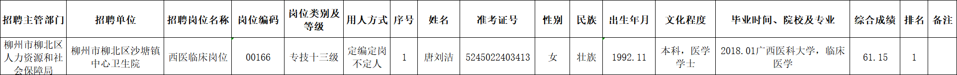 根據(jù)《柳州市2025年度下半年事業(yè)單位公開考試招聘工作人員公告》要求及安排,唐劉潔同志經(jīng)面試、考察、體檢合格,符合聘用條件。經(jīng)研究決定,擬聘用唐劉潔同志為我區(qū)事業(yè)單位工作人員,現(xiàn)予以公示,公示期為5個工作日(2026年1月22日至2026年1月28日)。對擬聘用的同志如有異議,請以書面形式,并署真實姓名和聯(lián)系地址,于2026年1月28日前郵寄或直接送我單位(地址:柳州市柳北區(qū)鷓鴣江六隊南200米(北外環(huán)路南)柳北區(qū)衛(wèi)生健康局512室;郵編:545002,電話0772-2802642),群眾如實反映有關問題受法律保護。