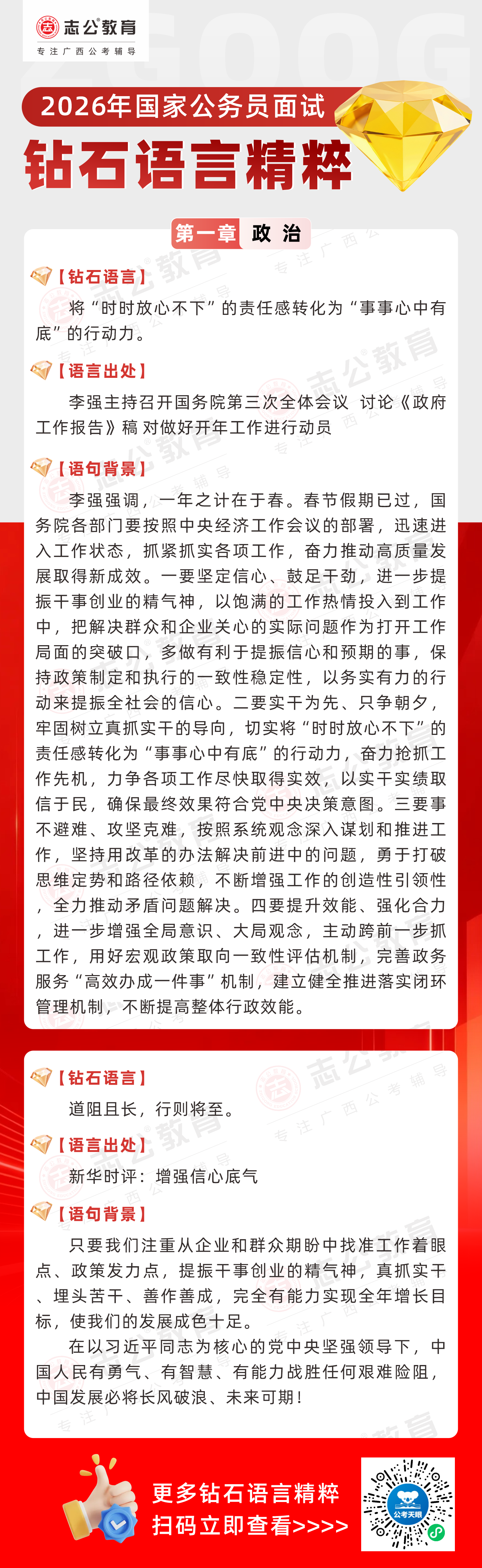 志公教育推出《2026國(guó)家公務(wù)員面試·鉆石語(yǔ)言精粹》政治篇!幫助考生把握政治類題目應(yīng)答邏輯,提升語(yǔ)言表達(dá)層次,助你在面試中脫穎而出。備考2026國(guó)考面試,從掌握“鉆石語(yǔ)言”開(kāi)始!