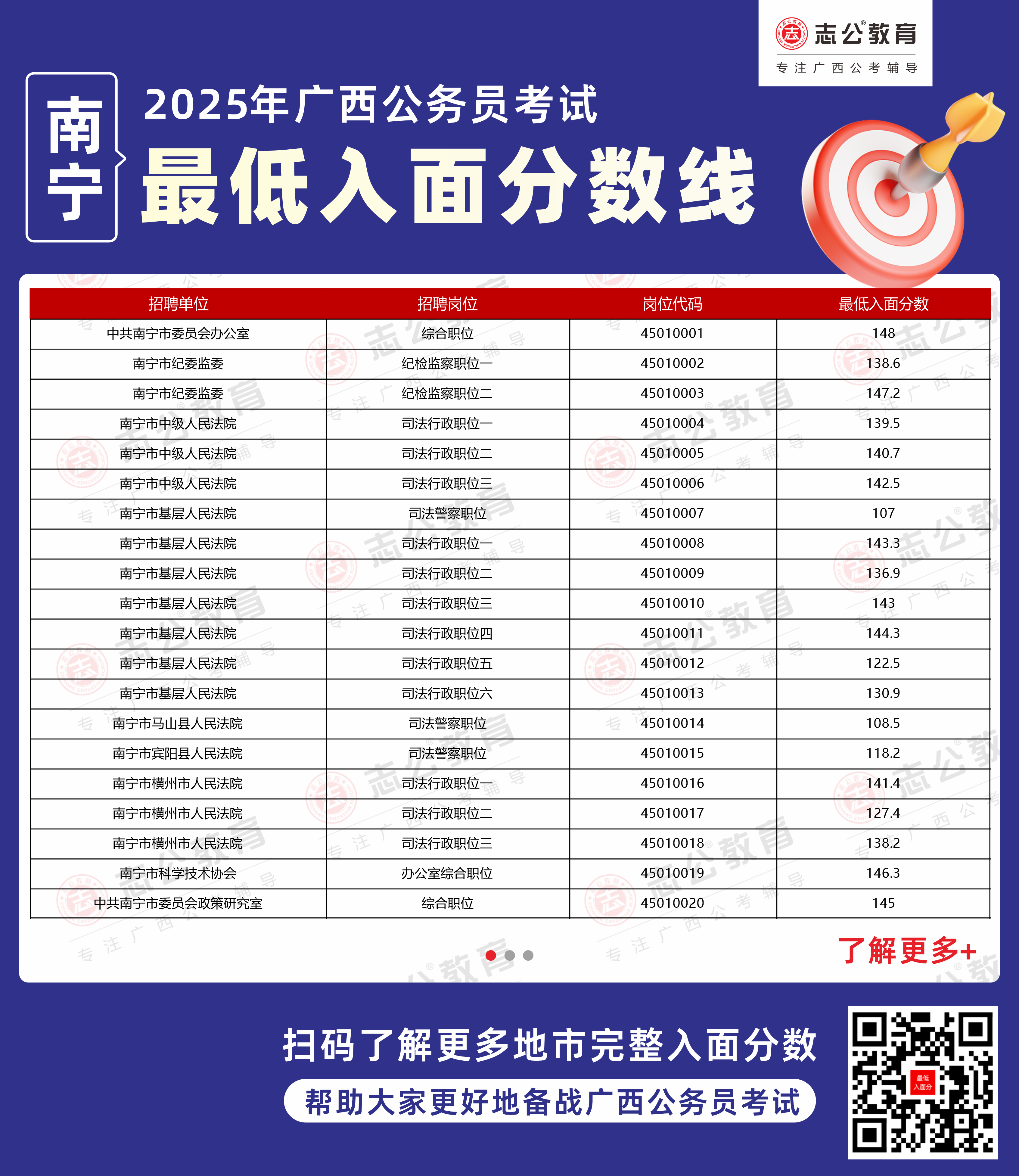 以下為志公教育根據(jù)官方公布的面試資格審查名單整理的南寧市部分單位的進(jìn)面最低筆試分?jǐn)?shù)(含照顧加分),數(shù)據(jù)僅供參考,具體以官方實(shí)際公布為準(zhǔn)。