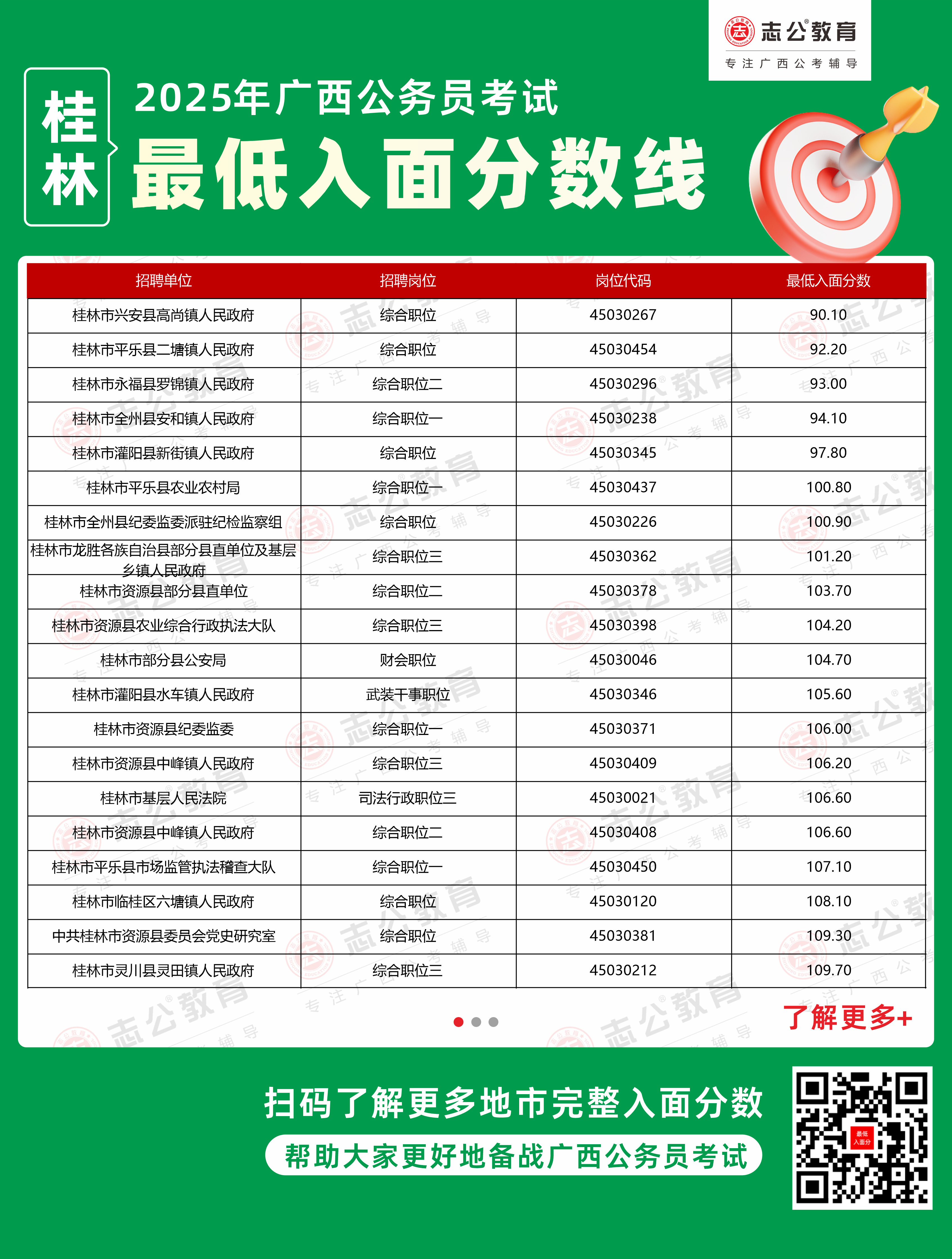 以下為志公教育根據(jù)官方公布的面試資格審查名單整理的桂林市部分單位的進(jìn)面最低筆試分?jǐn)?shù)(含照顧加分),數(shù)據(jù)僅供參考,具體以官方實(shí)際公布為準(zhǔn)。