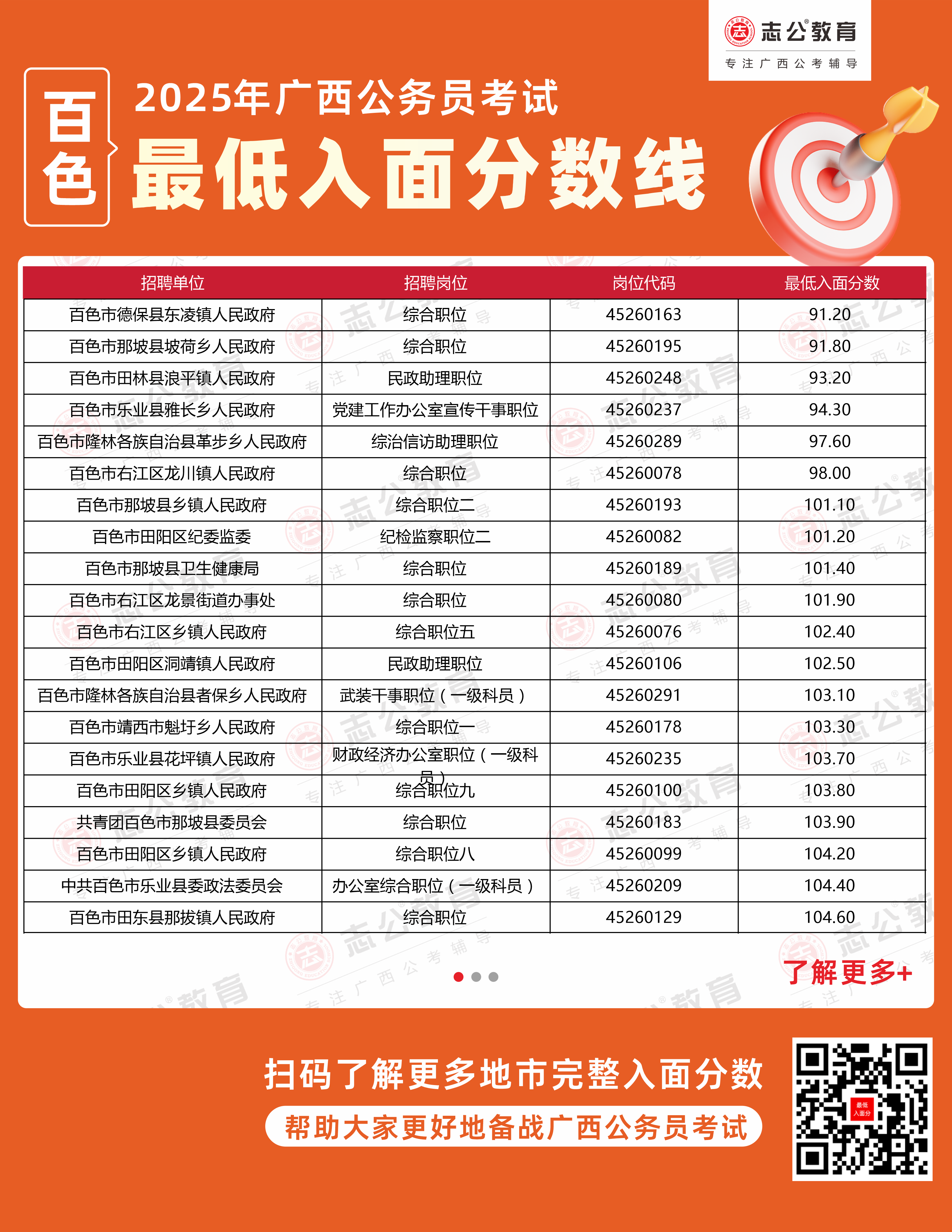 2025年廣西公務(wù)員考試筆試成績(jī)及面試入圍名單已公布。作為革命老區(qū)和廣西地域面積最大的地級(jí)市,百色市的招錄職位一直備受考生關(guān)注。為幫助考生了解各單位招錄情況,本文根據(jù)官方發(fā)布的面試資格審查公告,整理了部分百色市直及縣區(qū)單位的進(jìn)面分?jǐn)?shù)數(shù)據(jù),供廣大考生在備考過程中進(jìn)行參考。