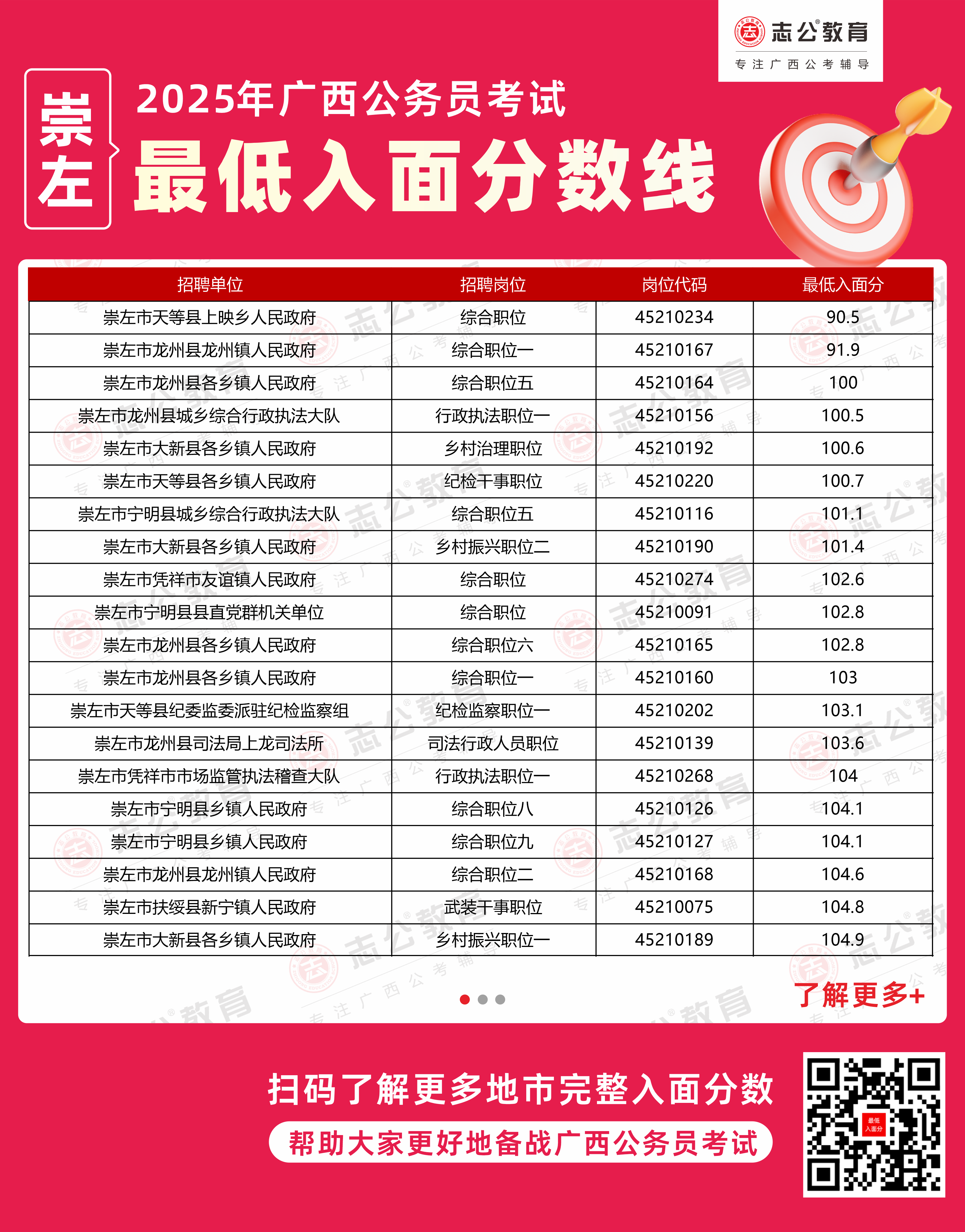 以下為志公教育根據(jù)官方公布的面試資格審查公告整理的崇左市部分單位的進面最低筆試分數(shù)(含照顧加分),數(shù)據(jù)僅供參考,具體以官方實際公布為準。