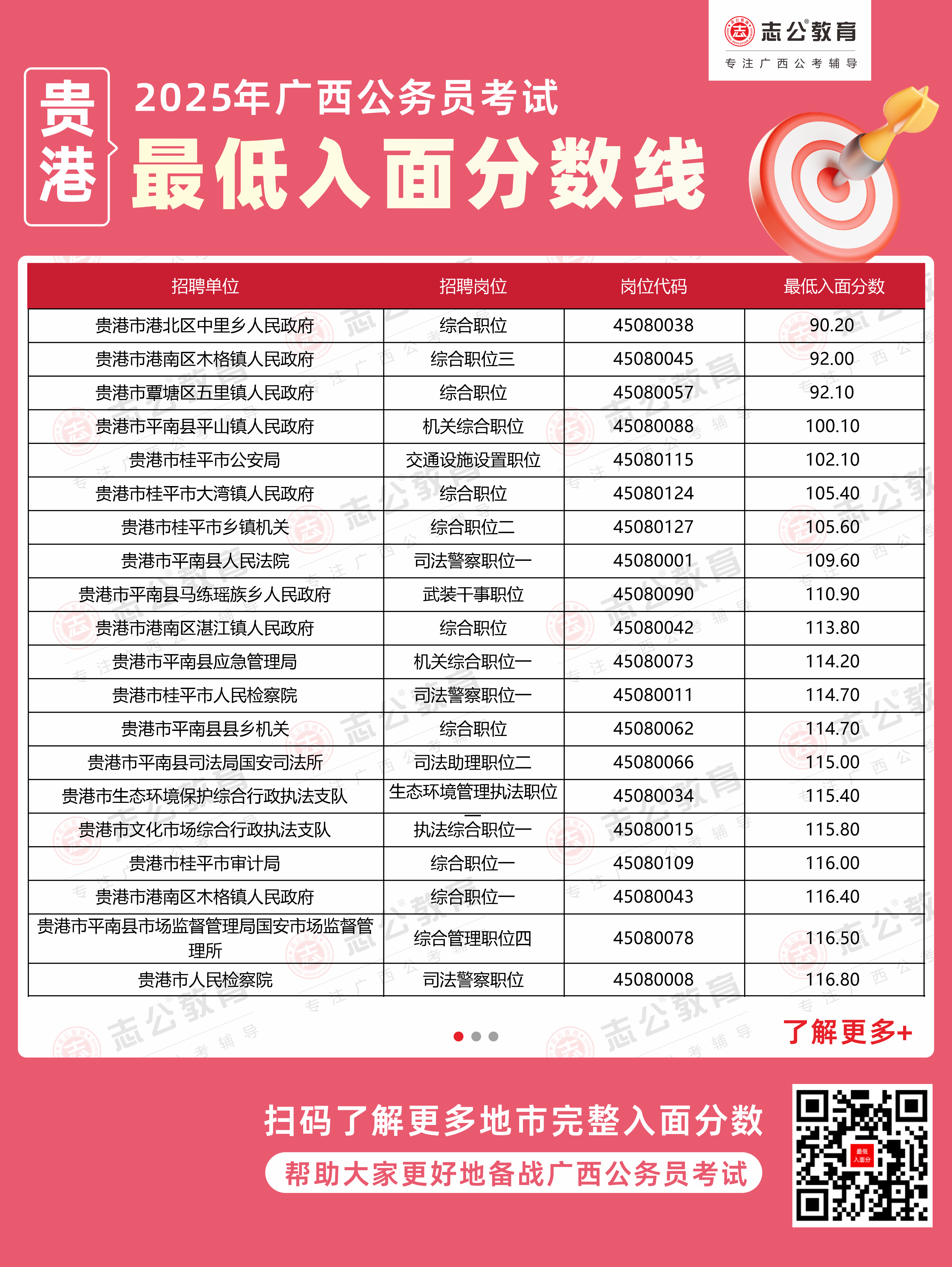 以下為志公教育根據(jù)官方發(fā)布的面試資格審查公告及公開數(shù)據(jù)整理的貴港市部分單位的進(jìn)面最低筆試分?jǐn)?shù)(含照顧加分),數(shù)據(jù)僅供參考,具體以官方實際公布為準(zhǔn)。