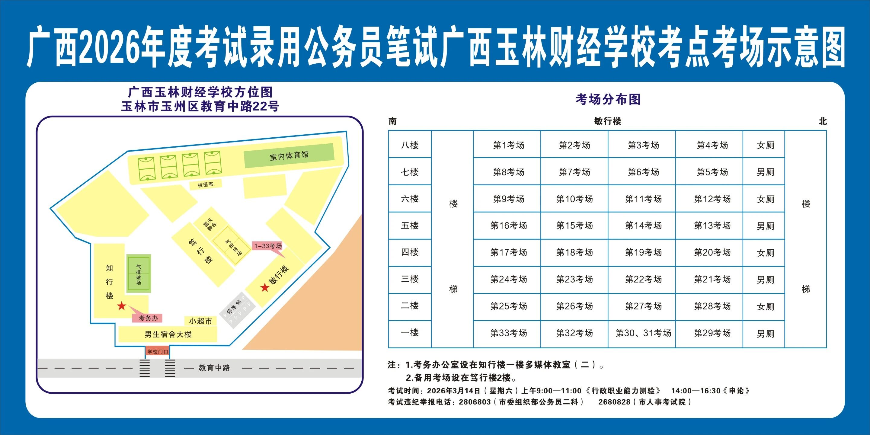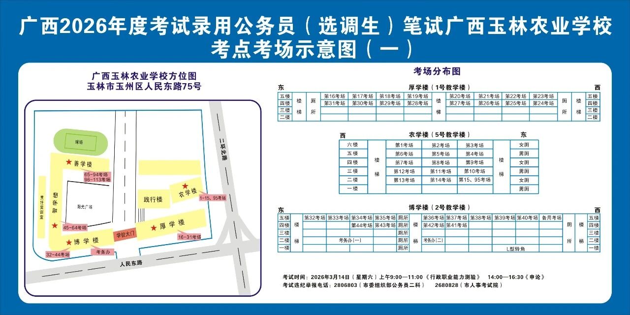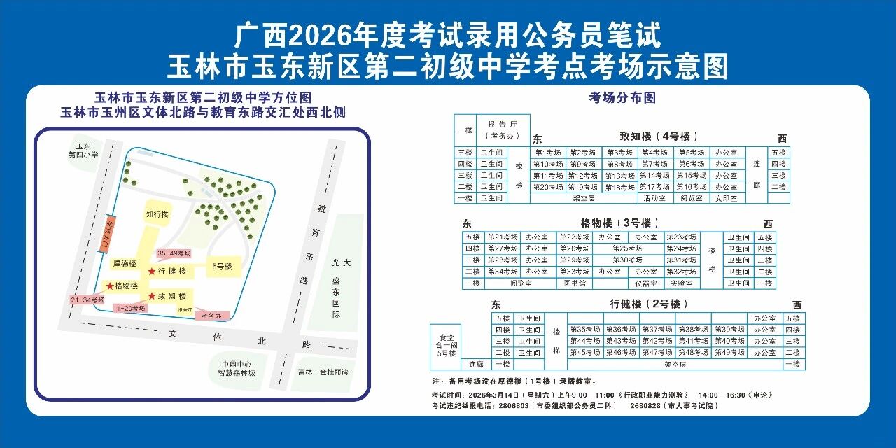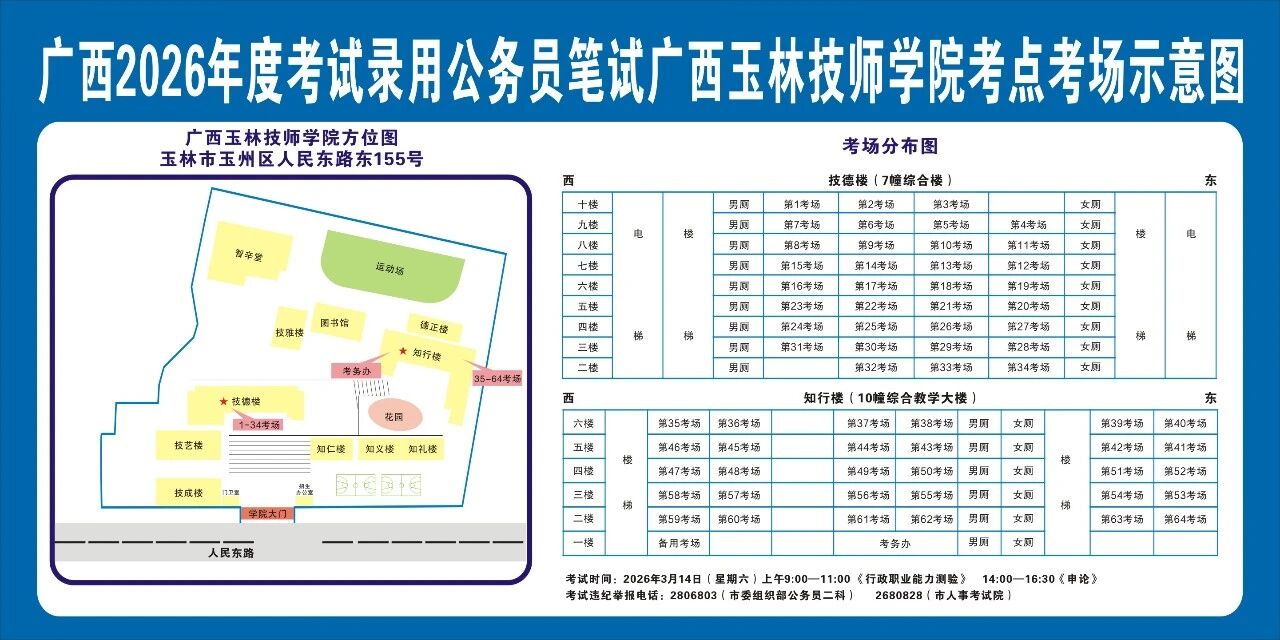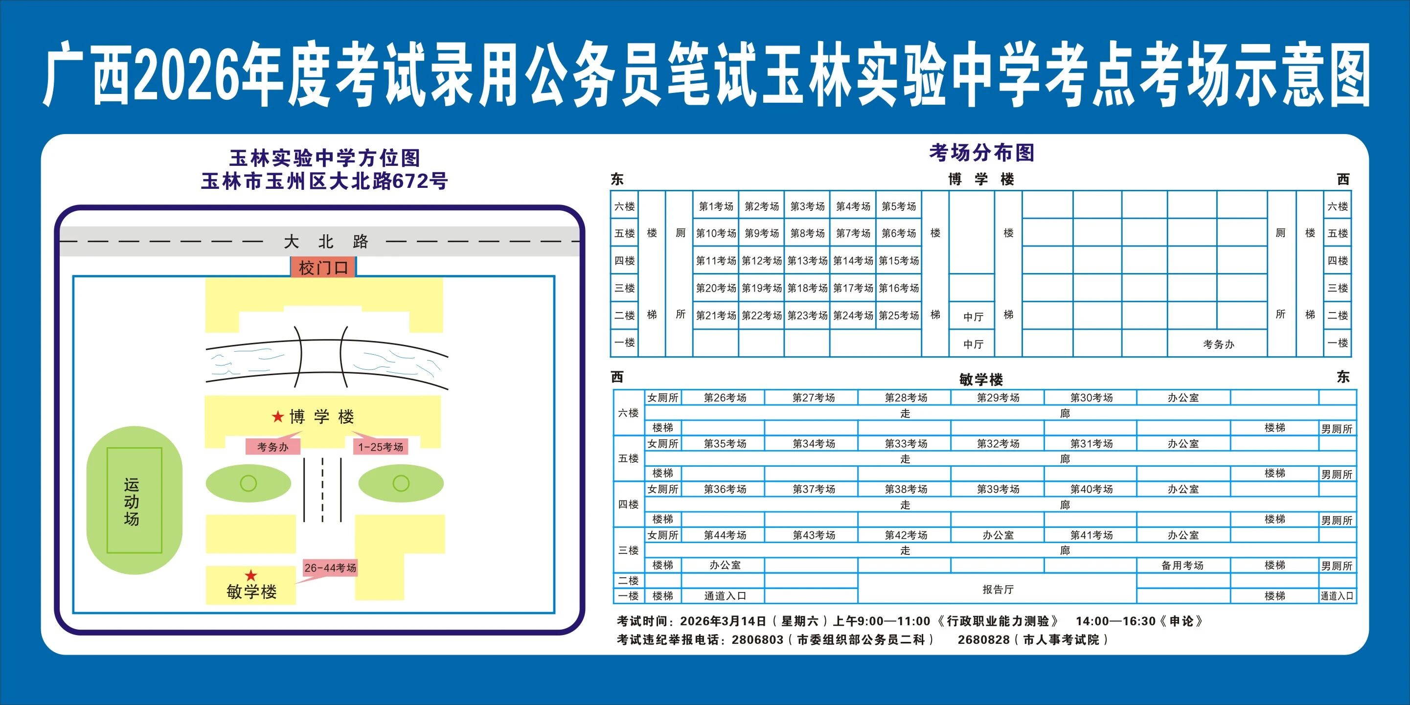 廣西2026年度考試錄用公務員(選調(diào)生)筆試將于3月14日舉行,為進一步提升玉林考區(qū)服務保障質(zhì)量,現(xiàn)就有關(guān)注意事項提示如下,請廣大考生做好應試準備工作,準確掌握考試時間、考點地址及相關(guān)注意事項。