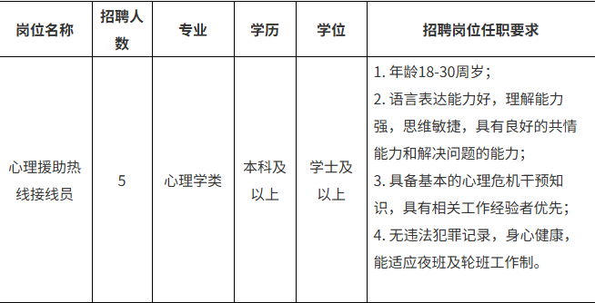 醫(yī)院承接“12356全國(guó)統(tǒng)一心理援助熱線”,提供24小時(shí)不間斷服務(wù)模式,由專職心理咨詢師、心理治療師及精神科醫(yī)護(hù)人員組成專業(yè)團(tuán)隊(duì),為來電者提供心理教育、心理咨詢、危機(jī)干預(yù)及心理健康科普服務(wù),覆蓋情緒舒緩、家庭關(guān)系、青少年心理咨詢等多類問題,為自殺高危人群提供快速響應(yīng)與轉(zhuǎn)介服務(wù)。為進(jìn)一步提升心理服務(wù)質(zhì)量、補(bǔ)充現(xiàn)有接線員力量,為公眾提供更優(yōu)質(zhì)、專業(yè)、高效的心理健康服務(wù),現(xiàn)面向社會(huì)招聘5名接線員。