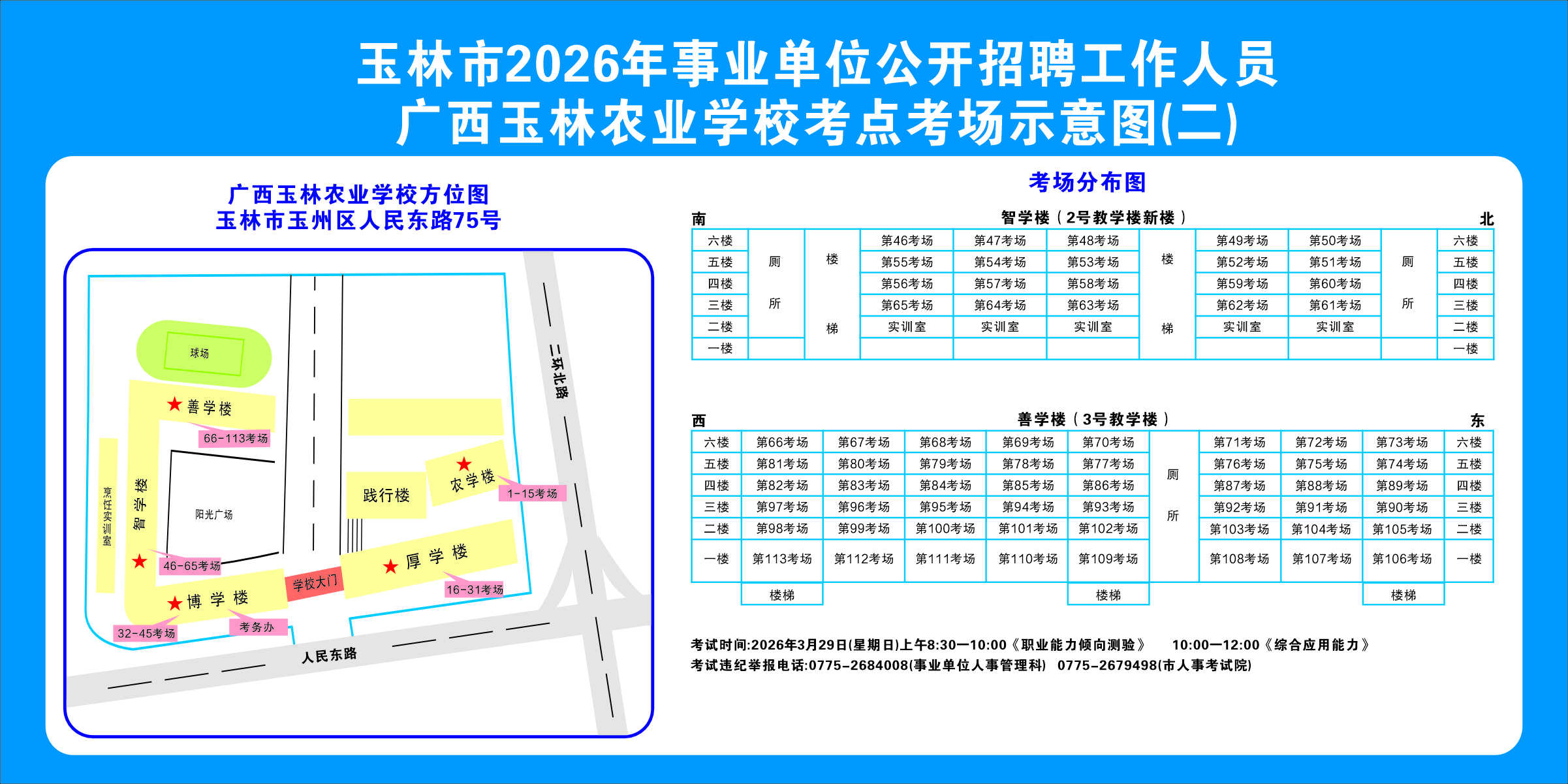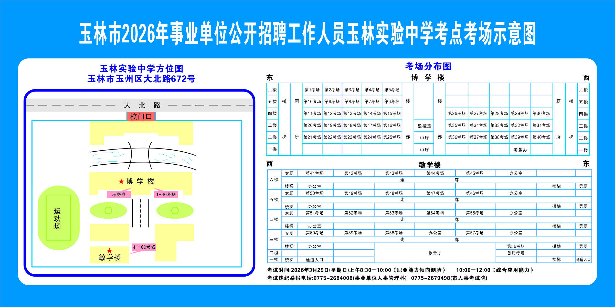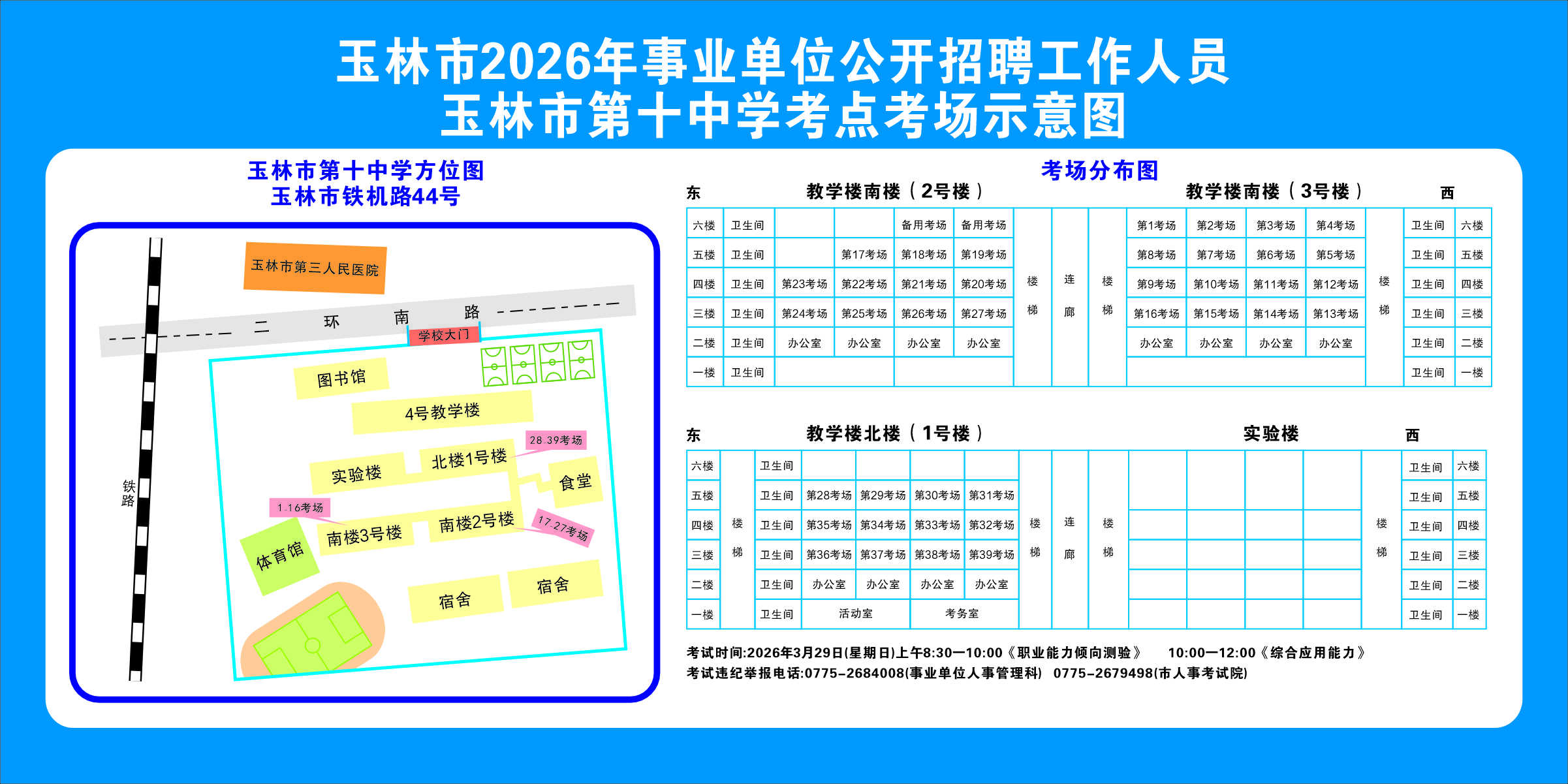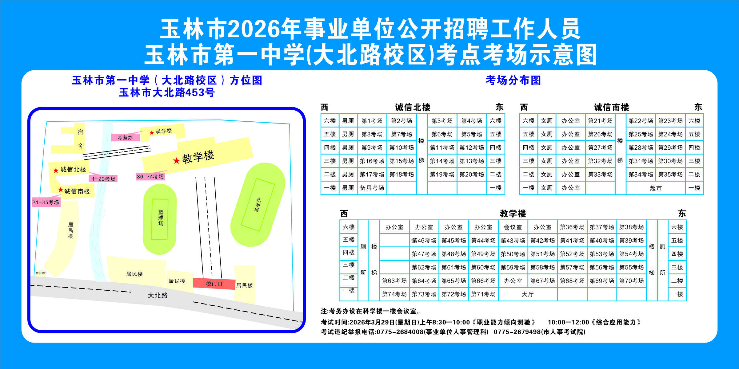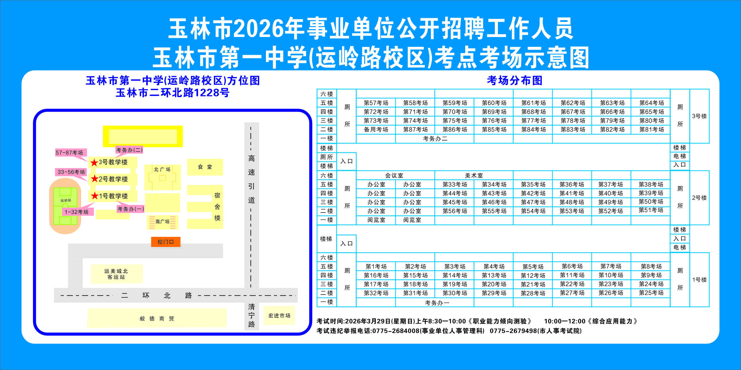 2.需要特別注意的是:玉林市第一職業(yè)中等專(zhuān)業(yè)學(xué)??键c(diǎn)是設(shè)在該校的東校區(qū)(人民東路東235號(hào));玉林市第一中學(xué)考點(diǎn)分為運(yùn)嶺路校區(qū)(二環(huán)北路1228號(hào))、大北路校區(qū)(大北路453號(hào))。