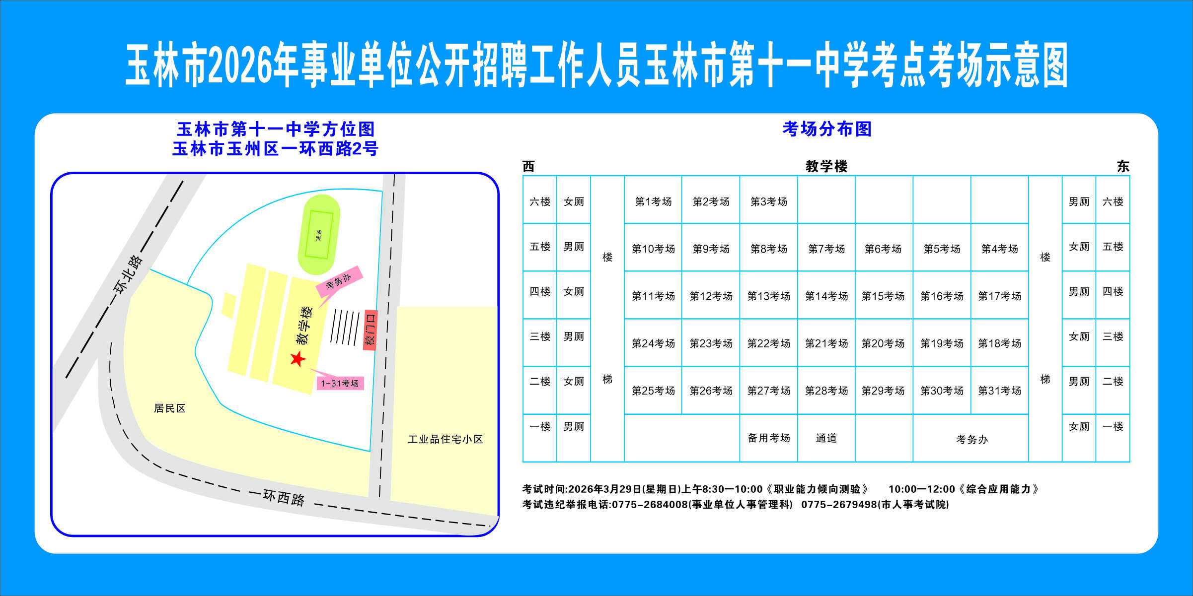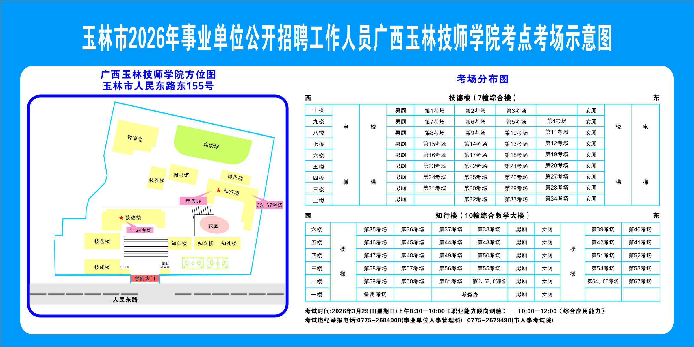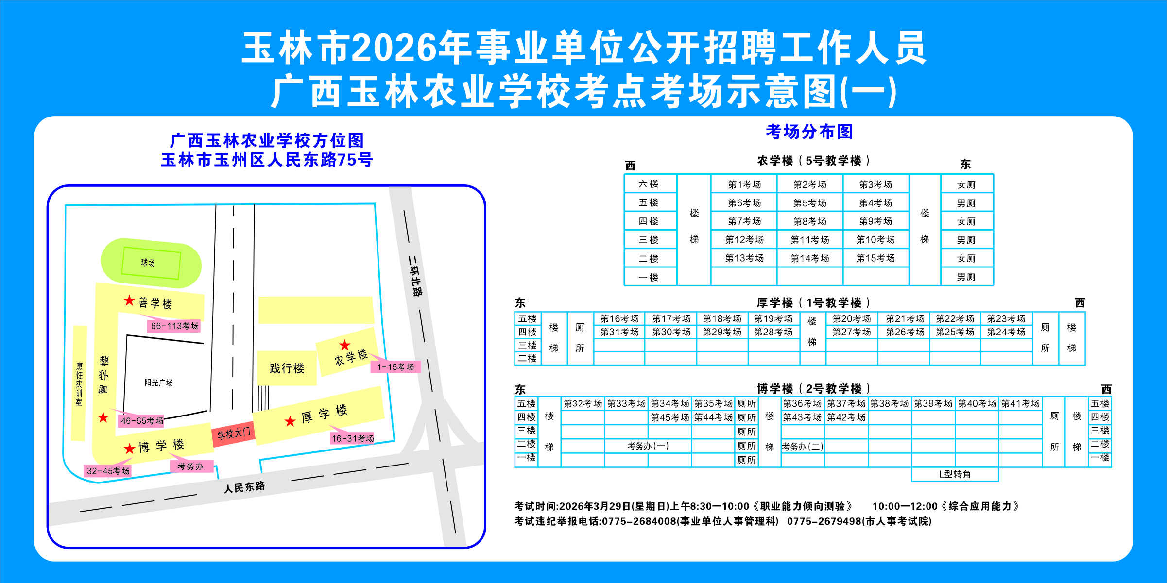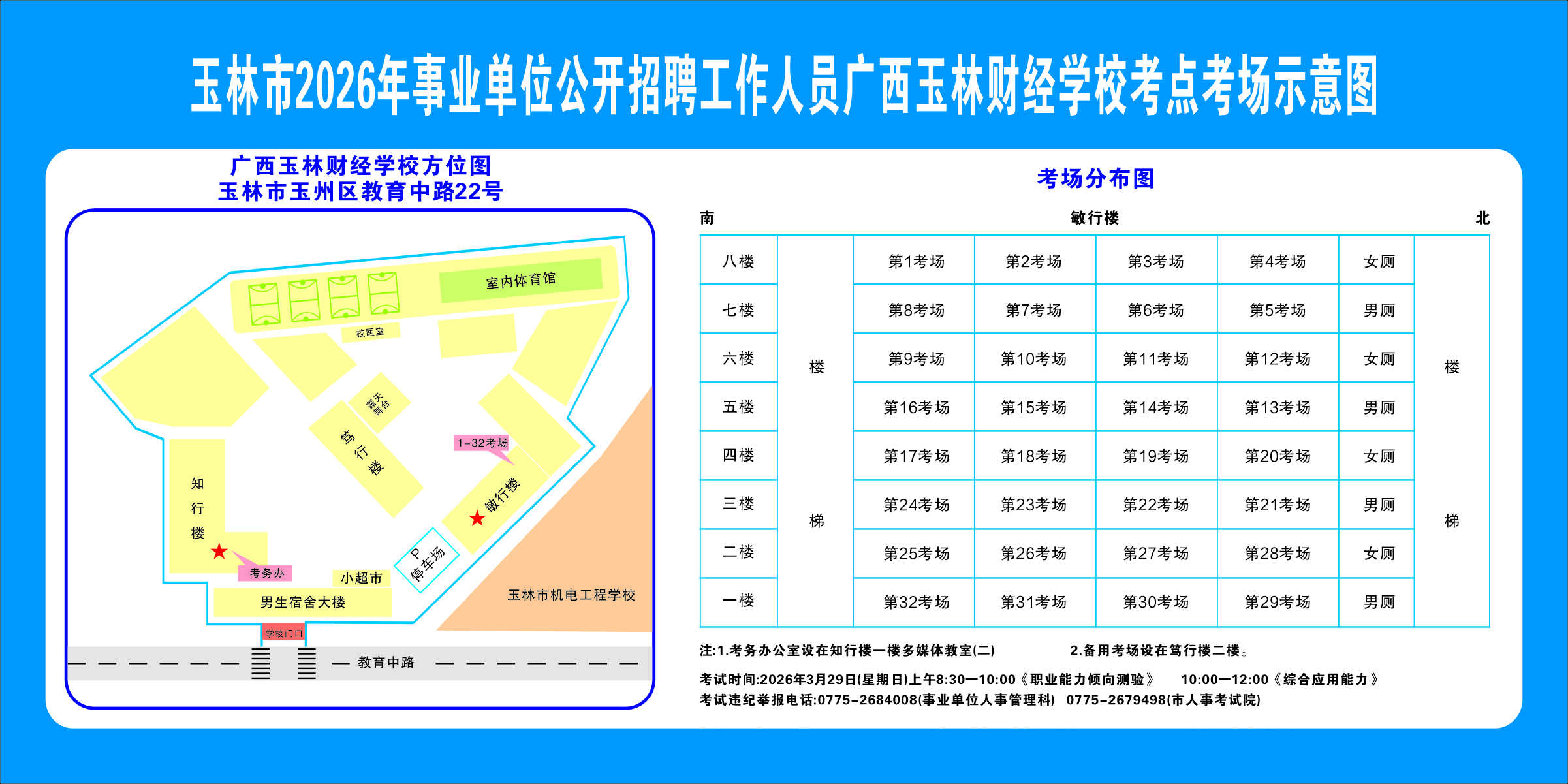 2.需要特別注意的是:玉林市第一職業(yè)中等專(zhuān)業(yè)學(xué)??键c(diǎn)是設(shè)在該校的東校區(qū)(人民東路東235號(hào));玉林市第一中學(xué)考點(diǎn)分為運(yùn)嶺路校區(qū)(二環(huán)北路1228號(hào))、大北路校區(qū)(大北路453號(hào))。