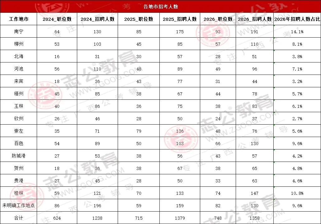 2026國考廣西招1358人,占全國招錄人數(shù)的3.56%,相比去年減少招錄人數(shù)21人。2026國考招錄人數(shù)呈縮減趨勢;基層崗位成主力;稅務(wù)、海關(guān)、邊檢為招錄大戶;應(yīng)屆生身份紅利顯著,超60%崗位限應(yīng)屆報考。