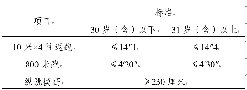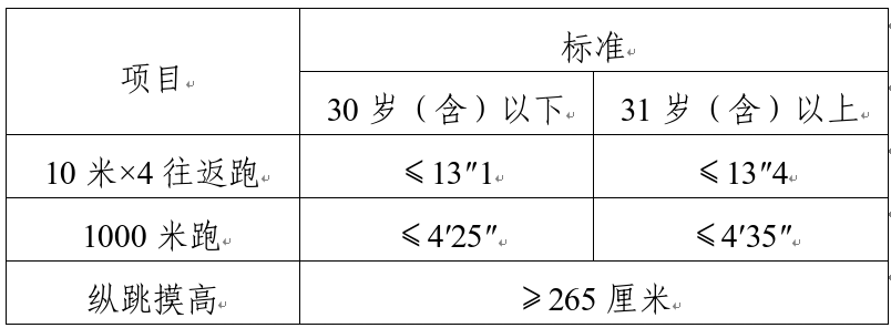 綜合管理類、執(zhí)法勤務(wù)類職位測查全部三個項目,三項全部達標(biāo)方為合格;警務(wù)技術(shù)類職位免予測查1000米(男)/800米(女)跑項目,其他兩項全部達標(biāo)方為合格;報考外語及少數(shù)民族語言翻譯緊缺職位的人員,體能測評三項中有兩項達標(biāo)的,視為合格。