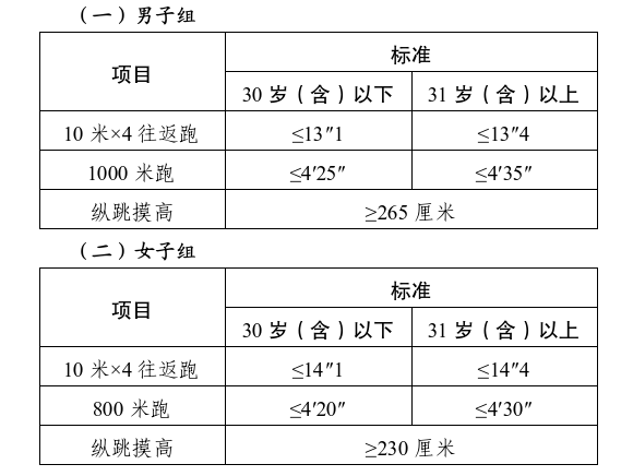 體能測評執(zhí)行中央組織部辦公廳、公安部辦公廳印發(fā)的《公安機關(guān)錄用人民警察體能測評項目和標(biāo)準(zhǔn)》(公政治〔2024〕60號)有關(guān)規(guī)定,縱跳摸高每人最多可測3次,10米×4往返跑每人最多可測2次,男子1000米(女子800米)每人最多可測1次。體能測評的項目和標(biāo)準(zhǔn)如下: